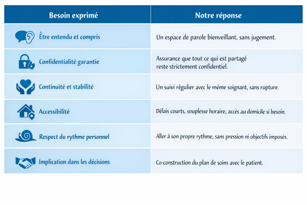 Nous recueillons systématiquement les besoins et attentes dès le premier contact, et tout au long du suivi, afin d’adapter nos soins en permanence. |